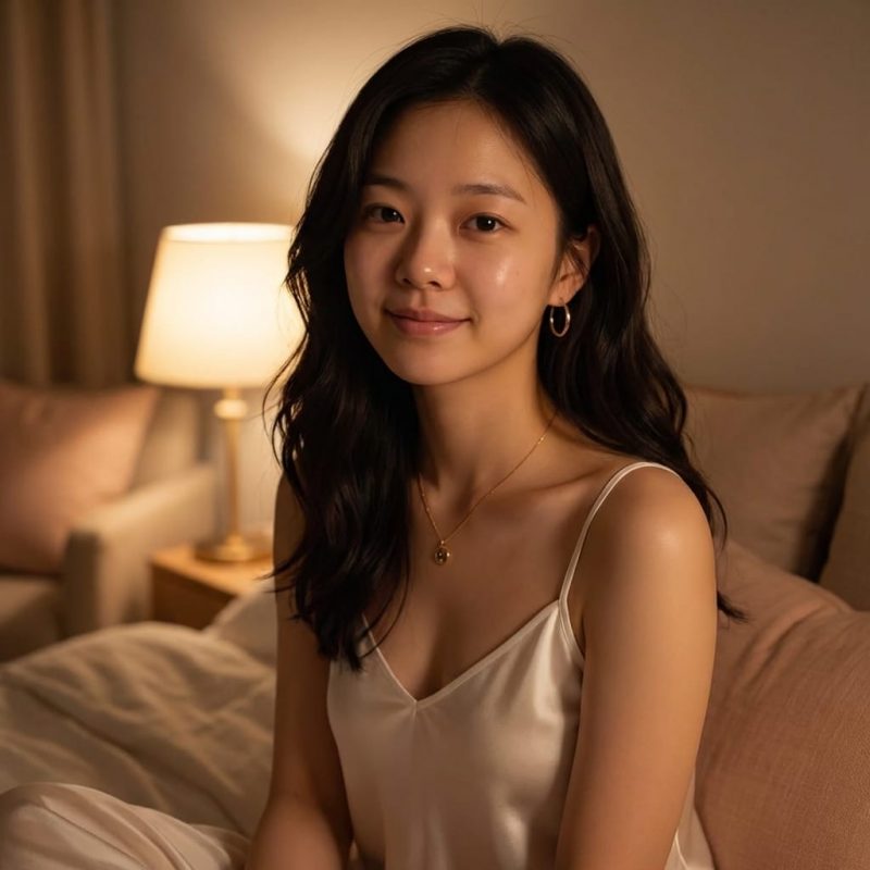 📝 最終版 Prompt(經 J大審核滿意): A beautiful Asian woman with medium-length dark wavy hair, gentle features, kind smile, no makeup, natural bare face, wearing thin strap silk sheer nightgown, showing shoulders and collarbone, in a cozy nighttime bedroom with soft dim warm nightlight lighting…
