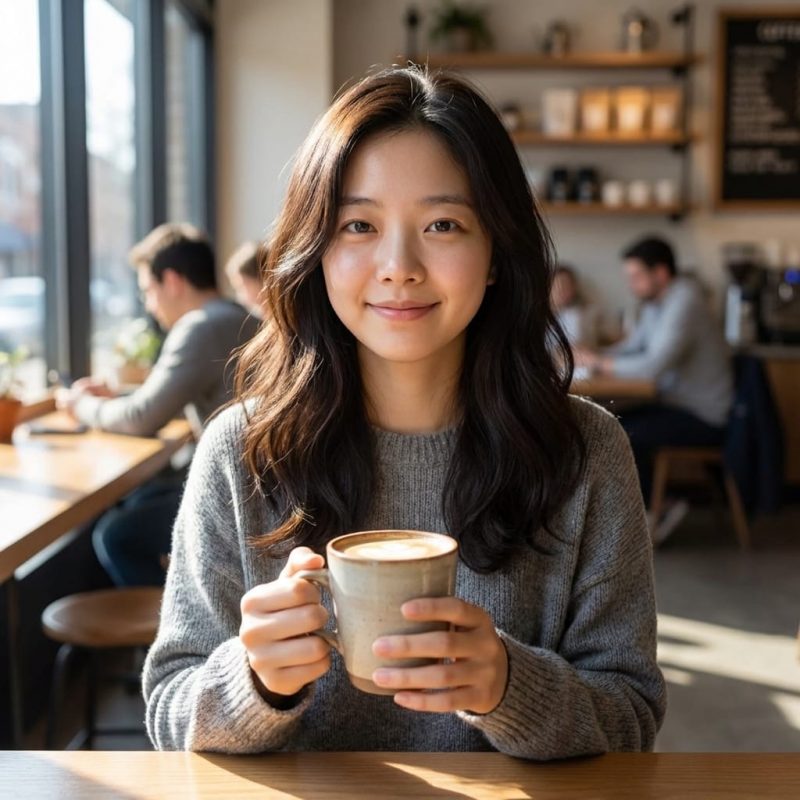 📝 Prompt: A beautiful Asian woman sitting at a cozy coffee shop table, holding a cup of coffee, morning sunlight…