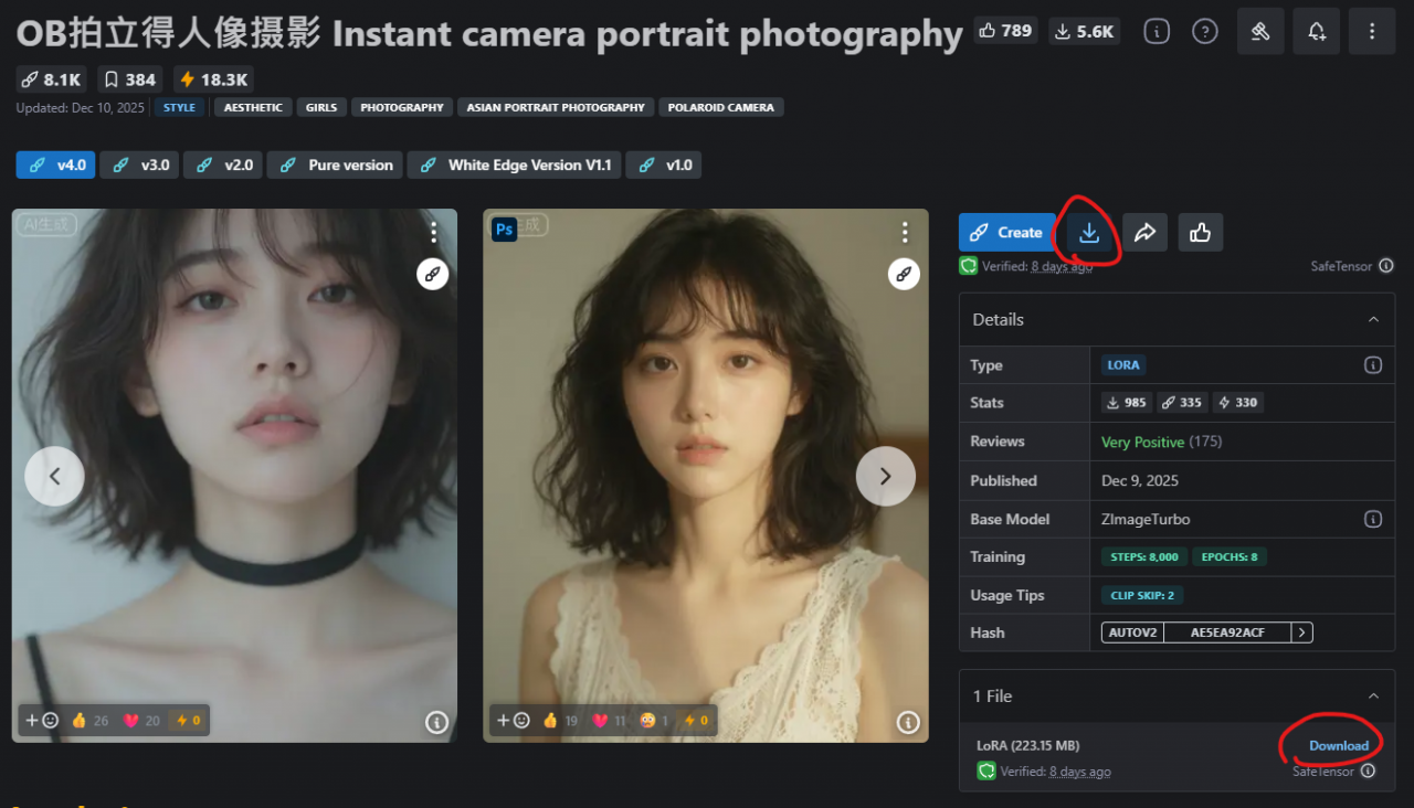 把下載後的檔案(以這個為例, 檔名為: OB拍立得人像摄影Instant camera portrait photography V4.0.safetensors ), 移到 D:\ComfyUI\models\loras 資料夾下(上面安裝教學時的第二個安裝位置就是這裡)