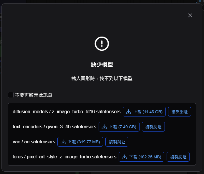 我已經把工作流做好載入時可以自動下載這些模型檔案, 不用一個一個下載而且要手動放到資料夾內
