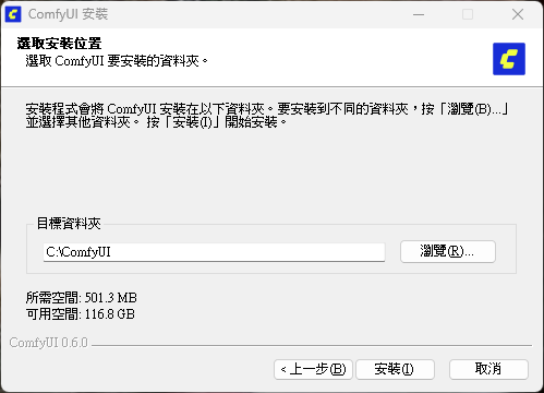 首先就是安裝位置, 建議將程式裝在C:\ComfyUI資料夾下.